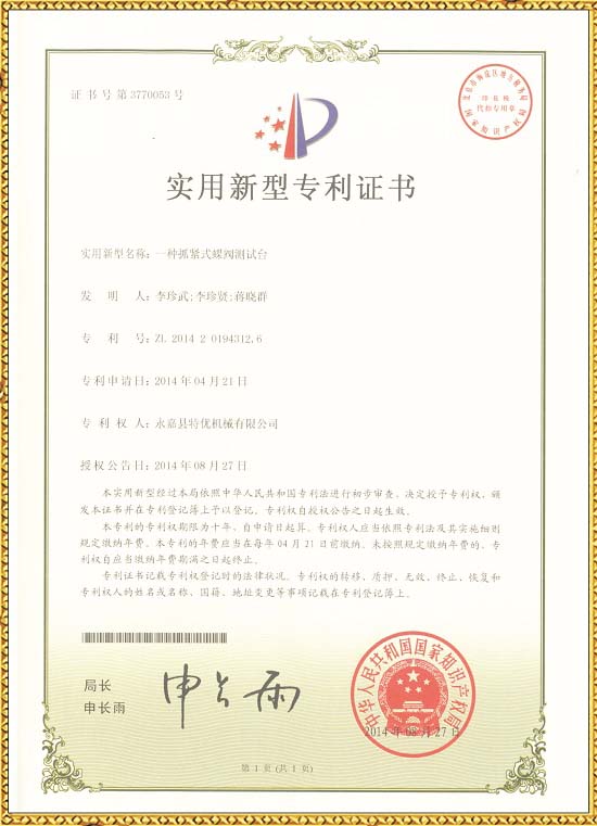 安全閥試驗(yàn)臺(tái)專利證書 蝶閥試壓臺(tái)專利證書