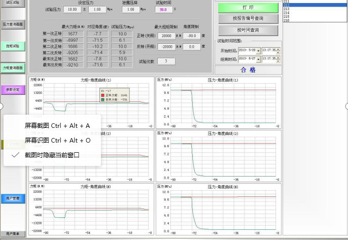 3、在進行閥門”啟閉扭矩測試”時,該裝置以液壓能為動力,液壓馬達(dá)產(chǎn)生可控可調(diào)的扭矩,通過扭矩傳感器和萬向節(jié)傳動桿,將扭矩傳至被測閥門,在被測閥門帶壓關(guān)閉或帶壓開啟時,啟閉閥門的扭矩由扭矩傳感器檢出信號,傳至“觸摸屏監(jiān)測系統(tǒng)”,系統(tǒng)實時地將檢測全過程的扭矩值,以曲線的形式,顯示和儲存在系統(tǒng)中,同時在系統(tǒng)中顯示最大的扭矩力,通過關(guān)鍵字,可檢索、查閱和打印扭矩檢測的數(shù)據(jù)和曲線。